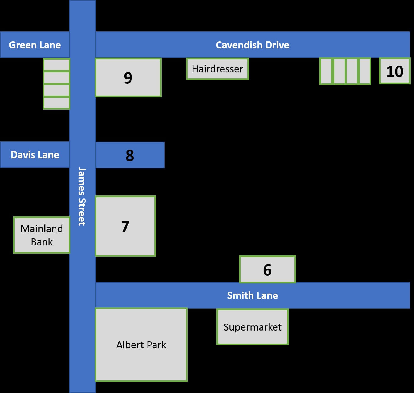Label the map below using NO MORE THAN TWO WORDS. Write your answers in boxes 6 – 10 in the answer sheet.